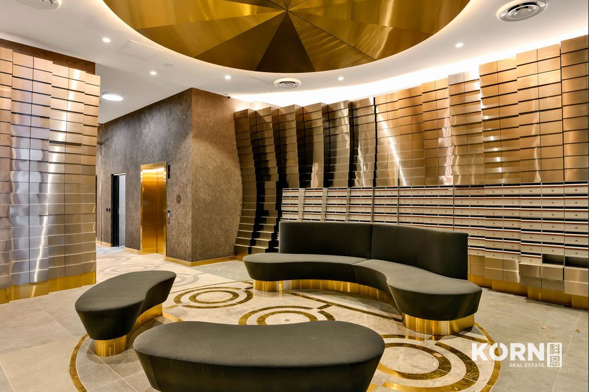 Entry to the building is via a five-star hotel-style lobby featuring an inlaid stone with a golden highlighted floor.